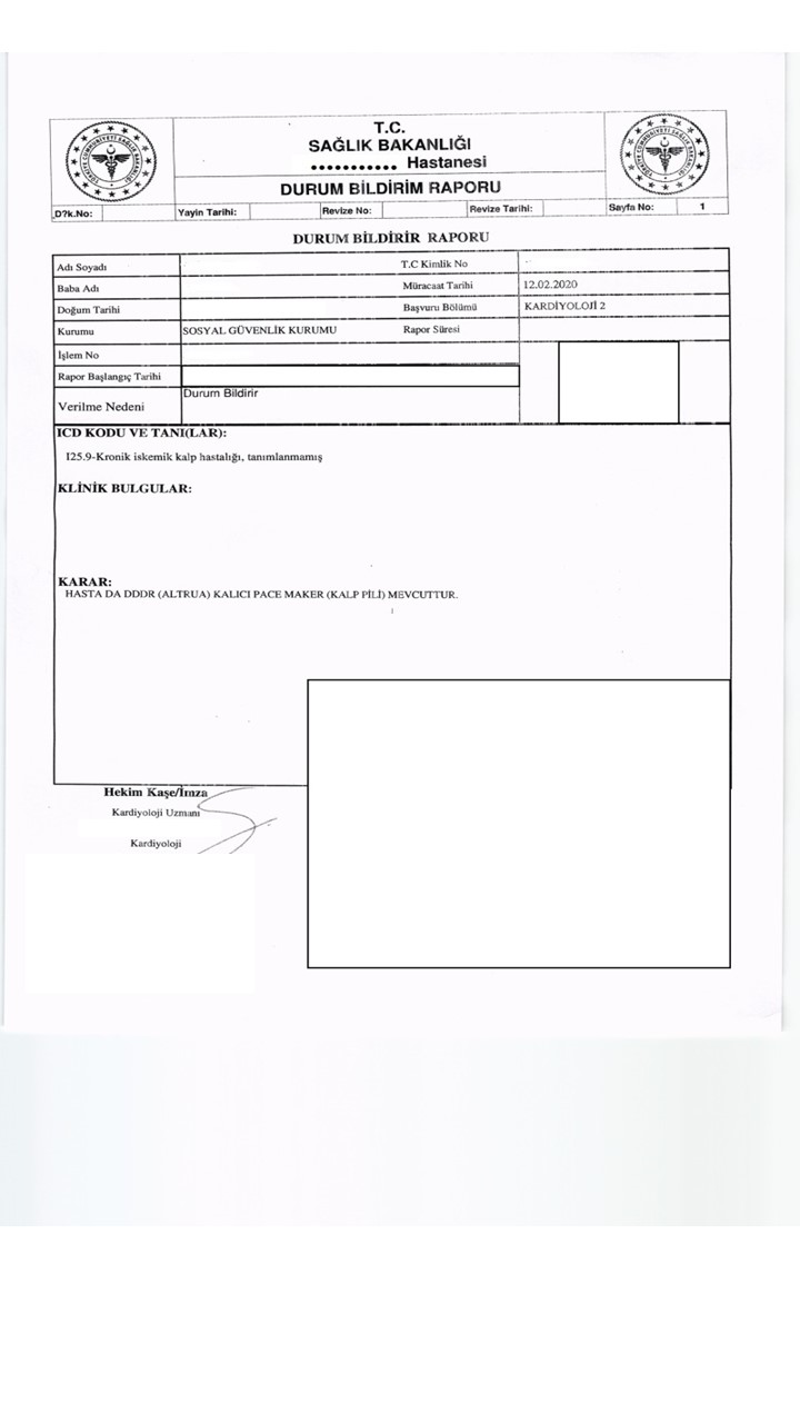 - Kalp pili kartı ve ameliyat sonrası epikriz raporu kabul edilmemektedir.